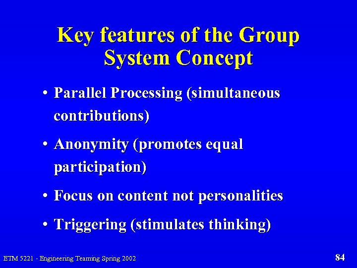 Key features of the Group System Concept • Parallel Processing (simultaneous contributions) • Anonymity (promotes equal participation) • Focus on content not personalities • Triggering (stimulates thinking) ETM 5221 - Engineering Teaming Spring 2002 84