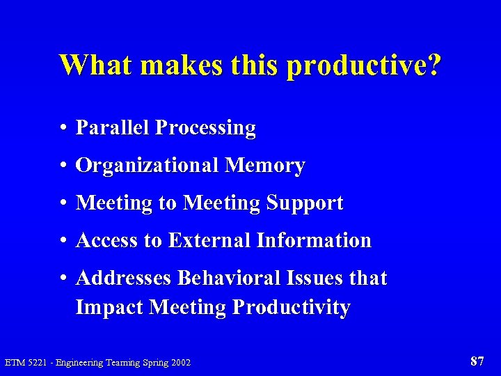 What makes this productive? • Parallel Processing • Organizational Memory • Meeting to Meeting Support • Access to External Information • Addresses Behavioral Issues that Impact Meeting Productivity ETM 5221 - Engineering Teaming Spring 2002 87