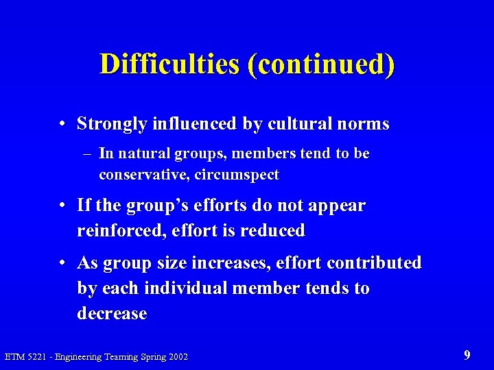Difficulties (continued) • Groups tend to have relatively low aspiration levels with respect to quality of solutions accepted – Once some level of acceptance is inferred, little further search happens • Often lack concern and method for dealing with way to best utilize and communicate members’ knowledge ETM 5221 - Engineering Teaming Spring 2002 8