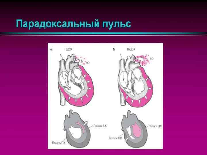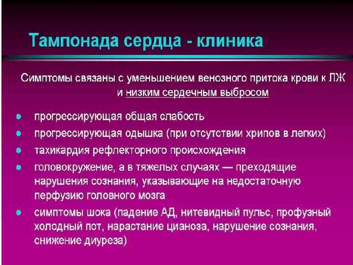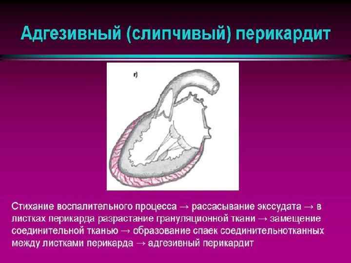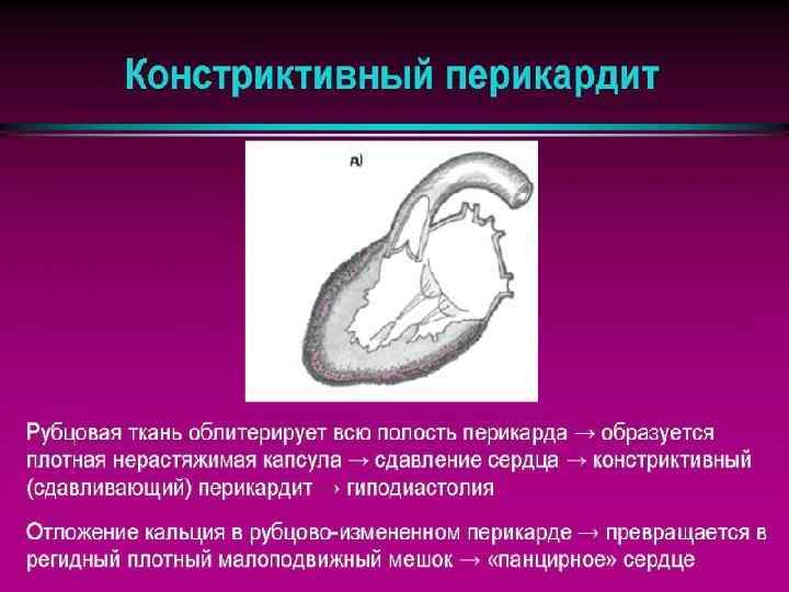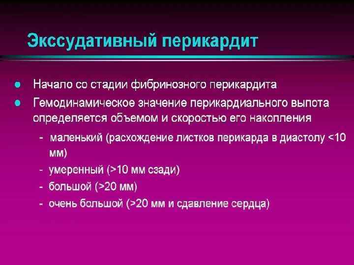 Клинико-морфологичекая классификация перикардитов I. Острые (< 6 недель от начала): Катаральный Сухой, или фибринозный Экссудативный (серозный, серозно-фибринозный, гнойный, геморрагический): ▪ без тампонады сердца; ▪ с тампонадой сердца. II. Подострые (от 6 нед. -6 мес. ): Выпотной, или экссудативный Слипчивый, или адгезивный Констриктивный: ▪ без тампонады сердца; ▪ с тампонадой сердца. III. Хронические (более 6 месяцев от начала заболевания): Выпотной, или экссудативный Слипчивый, или адгезивный. Констриктивный: ▪ с обызвествлением (“панцирное сердце”): ▪ без тампонады сердца; ▪ с тампонадой сердца.