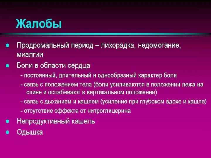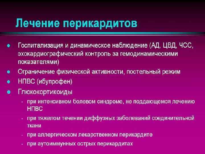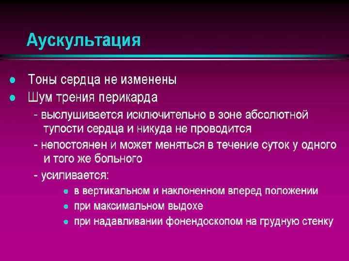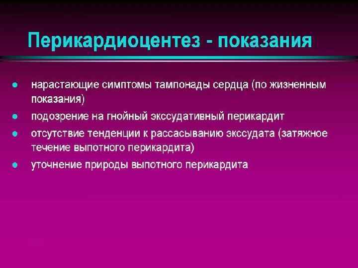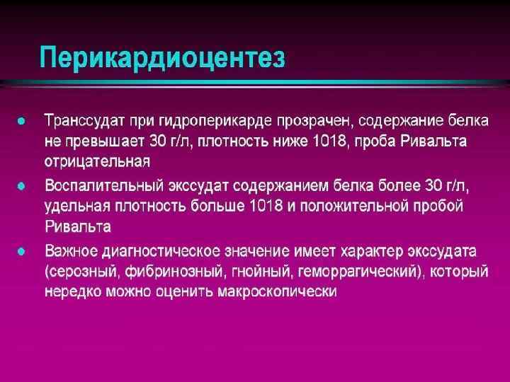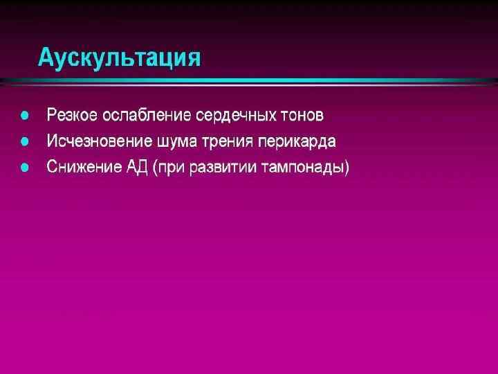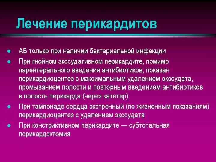 Этиология перикардитов Инфекционные: ▪ Вирусы вирусы Коксаки, ЕСНО, гриппа, герпеса, аденовирус и др. ▪ Бактерии (пневмококки, стафилококки, менингококки, стрептококки, микобактерии туберкулеза, хламидии, сальмонеллы и др. ) ▪ Грибковая инфекция ▪ Риккетсии Неинфекционные ▪ Аллергические ▪ (сывороточная болезнь, лекарственная аллергия и др. ) ▪ Диффузные заболевания соединительной ткани ▪ СКВ, ревматоидный артрит, системная склеродермия, ревматизм и др. ▪ ИМ ▪ Нарушения обмена веществ ▪ гипотиреоз, уремия, подагра, амилоидоз и др. ▪ Травма грудной клетки ▪ Ионизирующая радиация, рентгенотерапия ▪ Злокачественные опухоли ▪ Метастатические или первичные опухоли перикарда ▪ Гемобластозы ▪ Геморрагические диатезы
