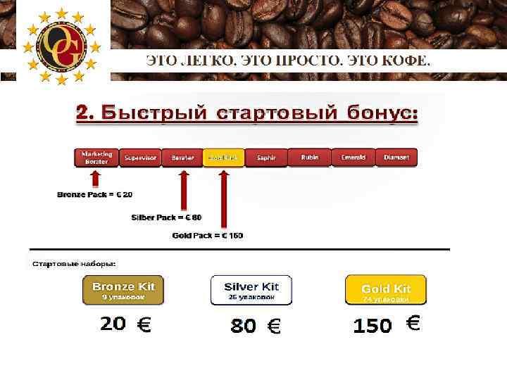 ВАРИАНТЫ ВХОДА В БИЗНЕС: 1. ПАКЕТ «БРОНЗА» (9 ПАКЕТОВ) – 200 CV 200 евро 2. ПАКЕТ «СЕРЕБРО» (26 ПАКЕТОВ) – 500 CV 500 евро 3. ПАКЕТ «ЗОЛОТО» (74 ПАКЕТА) – 1300 CV 1300 евро