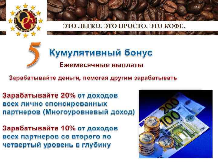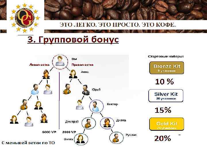 ВАРИАНТ ДОХОДА ЗА 1 - Й МЕСЯЦ РАБОТЫ (ВЫ СТАРТОВАЛИ С «ЗОЛОТЫМ ПАКЕТОМ» И ПОЛУЧАЕТЕ 20% ГРУППОВОГО БОНУСА) 1 -Я НЕДЕЛЯ: ВЫ ПРИГЛАСИЛИ 3 ЧЕЛОВЕКА. ОНИ ПРИОБРЕЛИ «БРОНЗОВЫЙ ПАКЕТ» . БОНУС БЫСТРОГО СТАРТА - 20 х 3 = 60 евро ГРУППОВОЙ БОНУС - 2 х 200 cv = 400 х 20% =80 ИТОГО: 140 евро 2 -Я НЕДЕЛЯ: ВАШИ ЛЮДИ СДЕЛАЛИ ТОЖЕ САМОЕ, ПРИГЛАСИЛИ ПО 3 ЧЕЛ. , С «БРОНЗОВЫМИ ПАКЕТАМИ» . У ВАС 9 ЧЕЛ. , ВЫПЛАТА ПО ГРУППОВОМУ БОНУСУ – 6 х 200 cv = 1200 х20% = 240 евро 3 -я НЕДЕЛЯ: В СТРУКТУРЕ 27 ЧЕЛ. , С «БРОНЗОВЫМ ПАКЕТОМ» . ВЫПЛАТА ПО ГРУППОВОМУ БОНУСУ – 18 х 200 cv = 3600 х 20% = 720 евро 4 -я НЕДЕЛЯ: В СТРУКТУРЕ 81 ЧЕЛ. , С «БРОНЗОВЫМ ПАКЕТОМ» . ВЫПЛАТА ПО ГРУППОВОМУ БОНУСУ – 54 х 200 cv = 10800 х 20%) = 2160 евро ОБЩАЯ СУММА ЗА МЕСЯЦ: 3260 ЕВРО