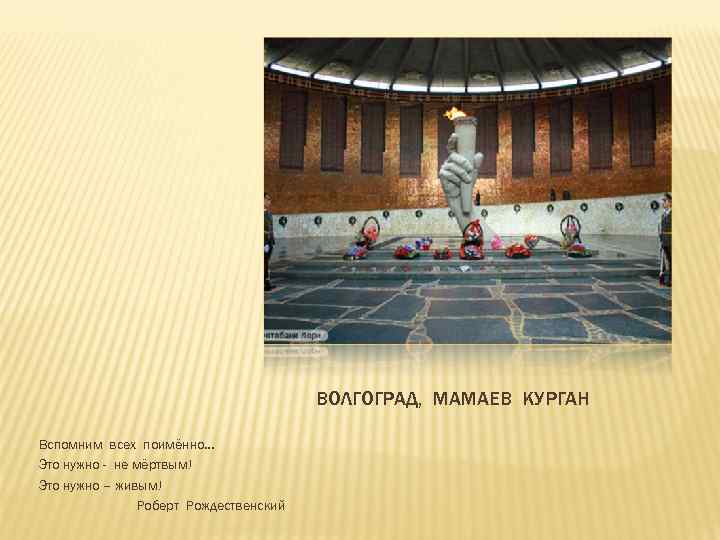 ВОЛГОГРАД, МАМАЕВ КУРГАН Вспомним всех поимённо… Это нужно - не мёртвым! Это нужно – живым! Роберт Рождественский