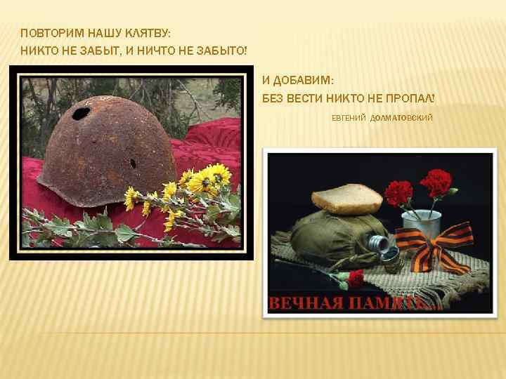 ПОВТОРИМ НАШУ КЛЯТВУ: НИКТО НЕ ЗАБЫТ, И НИЧТО НЕ ЗАБЫТО! И ДОБАВИМ: БЕЗ ВЕСТИ НИКТО НЕ ПРОПАЛ! ЕВГЕНИЙ ДОЛМАТОВСКИЙ