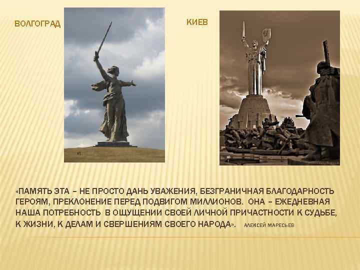 ВОЛГОГРАД КИЕВ «ПАМЯТЬ ЭТА – НЕ ПРОСТО ДАНЬ УВАЖЕНИЯ, БЕЗГРАНИЧНАЯ БЛАГОДАРНОСТЬ ГЕРОЯМ, ПРЕКЛОНЕНИЕ ПЕРЕД ПОДВИГОМ МИЛЛИОНОВ. ОНА – ЕЖЕДНЕВНАЯ НАША ПОТРЕБНОСТЬ В ОЩУЩЕНИИ СВОЕЙ ЛИЧНОЙ ПРИЧАСТНОСТИ К СУДЬБЕ, К ЖИЗНИ, К ДЕЛАМ И СВЕРШЕНИЯМ СВОЕГО НАРОДА» . АЛЕКСЕЙ МАРЕСЬЕВ