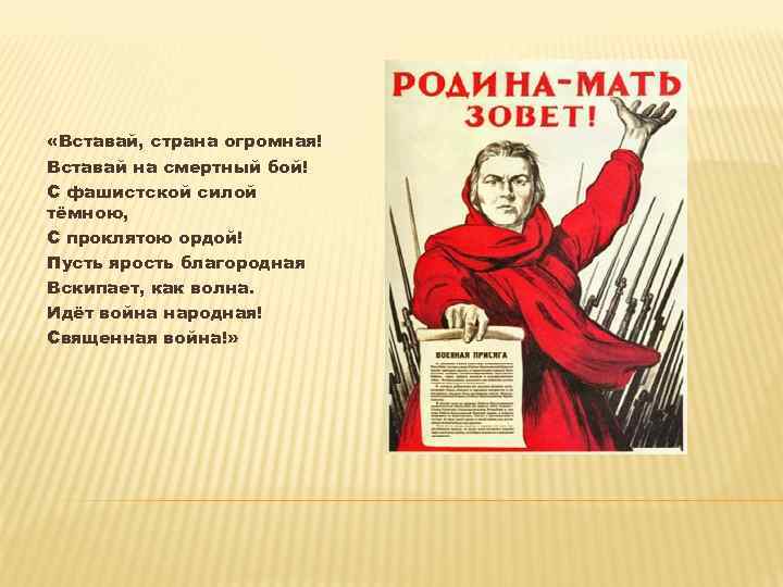 «Вставай, страна огромная! Вставай на смертный бой! С фашистской силой тёмною, С проклятою ордой! Пусть ярость благородная Вскипает, как волна. Идёт война народная! Священная война!»