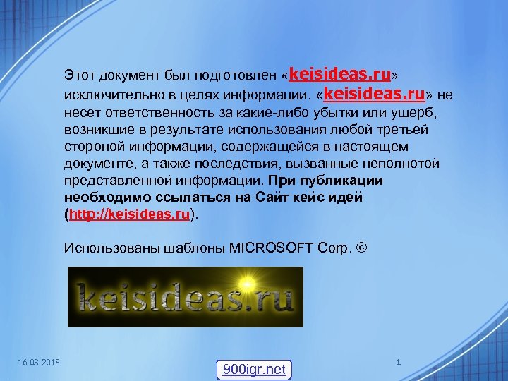 Этот документ был подготовлен «keisideas. ru» исключительно в целях информации. «keisideas. ru» не несет ответственность за какие-либо убытки или ущерб, возникшие в результате использования любой третьей стороной информации, содержащейся в настоящем документе, а также последствия, вызванные неполнотой представленной информации. При публикации необходимо ссылаться на Сайт кейс идей (http: //keisideas. ru). Использованы шаблоны MICROSOFT Corp. © 16. 03. 2018 900 igr. net 1