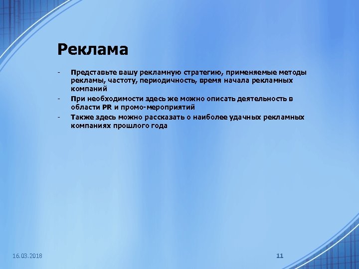 Реклама - - 16. 03. 2018 Представьте вашу рекламную стратегию, применяемые методы рекламы, частоту, периодичность, время начала рекламных компаний При необходимости здесь же можно описать деятельность в области PR и промо-мероприятий Также здесь можно рассказать о наиболее удачных рекламных компаниях прошлого года 11