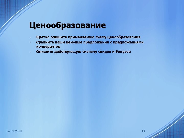 Ценообразование - 16. 03. 2018 Кратко опишите применяемую схему ценообразования Сравните ваши ценовые предложения с предложениями конкурентов Опишите действующую систему скидок и бонусов 12