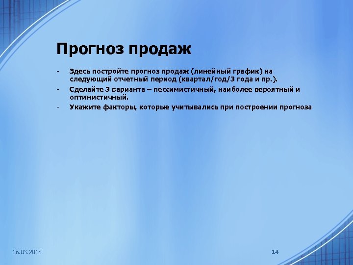 Прогноз продаж - 16. 03. 2018 Здесь постройте прогноз продаж (линейный график) на следующий отчетный период (квартал/год/3 года и пр. ). Сделайте 3 варианта – пессимистичный, наиболее вероятный и оптимистичный. Укажите факторы, которые учитывались при построении прогноза 14