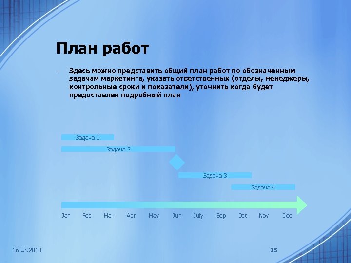 План работ - Здесь можно представить общий план работ по обозначенным задачам маркетинга, указать ответственных (отделы, менеджеры, контрольные сроки и показатели), уточнить когда будет предоставлен подробный план Задача 1 Задача 2 Задача 3 Задача 4 Jan 16. 03. 2018 Feb Mar Apr May Jun July Sep Oct Nov Dec 15