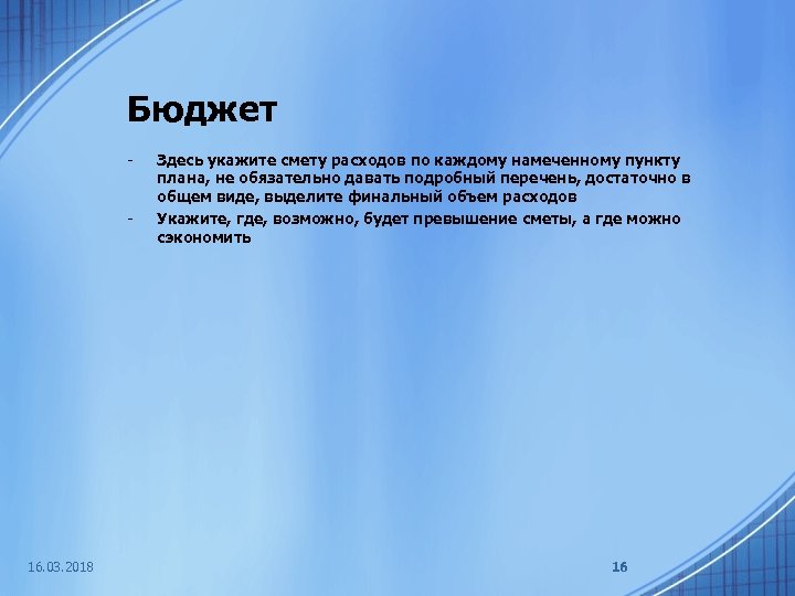 Бюджет - - 16. 03. 2018 Здесь укажите смету расходов по каждому намеченному пункту плана, не обязательно давать подробный перечень, достаточно в общем виде, выделите финальный объем расходов Укажите, где, возможно, будет превышение сметы, а где можно сэкономить 16