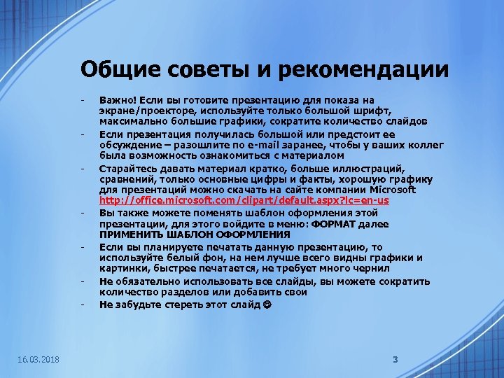 Общие советы и рекомендации - - 16. 03. 2018 Важно! Если вы готовите презентацию для показа на экране/проекторе, используйте только большой шрифт, максимально большие графики, сократите количество слайдов Если презентация получилась большой или предстоит ее обсуждение – разошлите по e-mail заранее, чтобы у ваших коллег была возможность ознакомиться с материалом Старайтесь давать материал кратко, больше иллюстраций, сравнений, только основные цифры и факты, хорошую графику для презентаций можно скачать на сайте компании Microsoft http: //office. microsoft. com/clipart/default. aspx? lc=en-us Вы также можете поменять шаблон оформления этой презентации, для этого войдите в меню: ФОРМАТ далее ПРИМЕНИТЬ ШАБЛОН ОФОРМЛЕНИЯ Если вы планируете печатать данную презентацию, то используйте белый фон, на нем лучше всего видны графики и картинки, быстрее печатается, не требует много чернил Не обязательно использовать все слайды, вы можете сократить количество разделов или добавить свои Не забудьте стереть этот слайд 3
