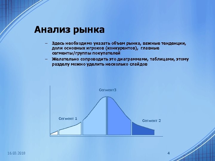 Анализ рынка – – Здесь необходимо указать объем рынка, важные тенденции, доли основных игроков (конкурентов), главные сегменты/группы покупателей Желательно сопроводить это диаграммами, таблицами, этому разделу можно уделить несколько слайдов Сегмент3 Сегмент 1 16. 03. 2018 Сегмент 2 4