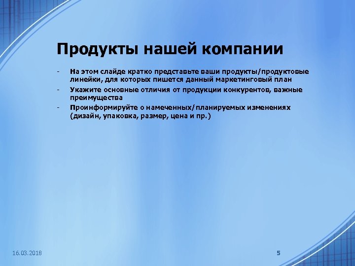 Продукты нашей компании - 16. 03. 2018 На этом слайде кратко представьте ваши продукты/продуктовые линейки, для которых пишется данный маркетинговый план Укажите основные отличия от продукции конкурентов, важные преимущества Проинформируйте о намеченных/планируемых изменениях (дизайн, упаковка, размер, цена и пр. ) 5