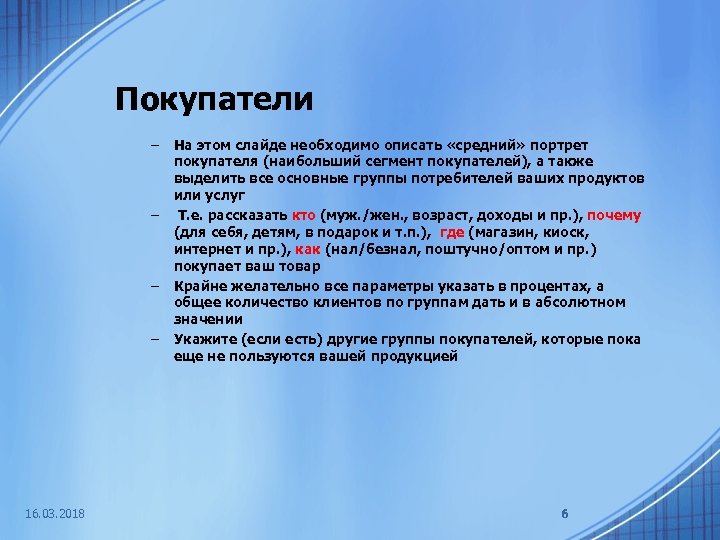 Покупатели – – 16. 03. 2018 На этом слайде необходимо описать «средний» портрет покупателя (наибольший сегмент покупателей), а также выделить все основные группы потребителей ваших продуктов или услуг Т. е. рассказать кто (муж. /жен. , возраст, доходы и пр. ), почему (для себя, детям, в подарок и т. п. ), где (магазин, киоск, интернет и пр. ), как (нал/безнал, поштучно/оптом и пр. ) покупает ваш товар Крайне желательно все параметры указать в процентах, а общее количество клиентов по группам дать и в абсолютном значении Укажите (если есть) другие группы покупателей, которые пока еще не пользуются вашей продукцией 6