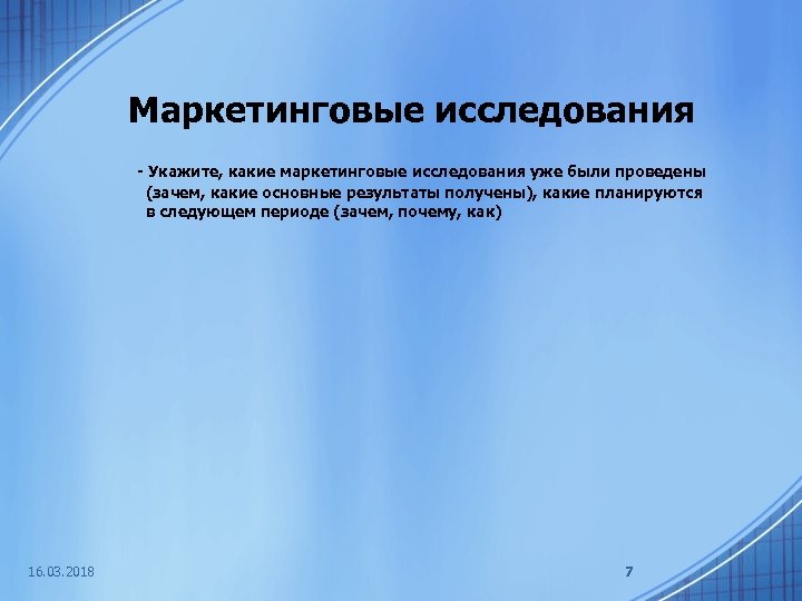 Маркетинговые исследования - Укажите, какие маркетинговые исследования уже были проведены (зачем, какие основные результаты получены), какие планируются в следующем периоде (зачем, почему, как) 16. 03. 2018 7