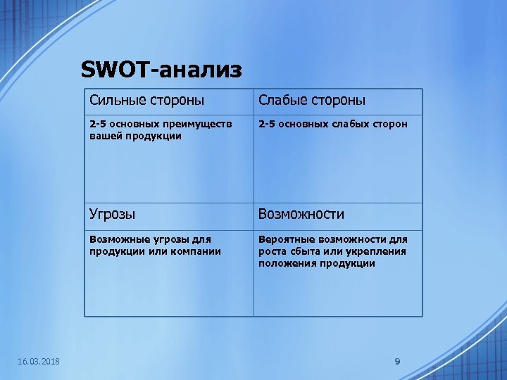 SWOT-анализ Сильные стороны 2 -5 основных преимуществ вашей продукции 2 -5 основных слабых сторон Угрозы Возможности Возможные угрозы для продукции или компании 16. 03. 2018 Слабые стороны Вероятные возможности для роста сбыта или укрепления положения продукции 9