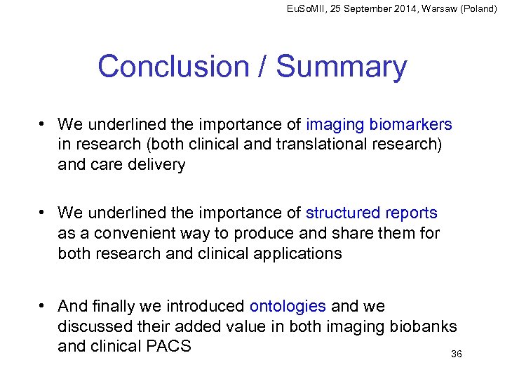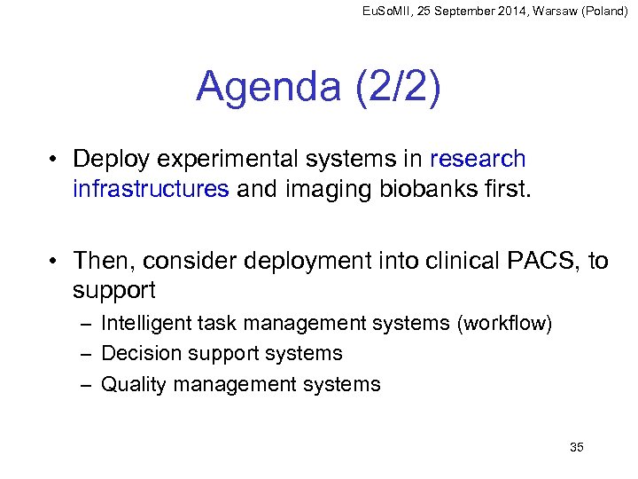 Eu. So. MII, 25 September 2014, Warsaw (Poland) Agenda (2/2) • Deploy experimental systems in research infrastructures and imaging biobanks first. • Then, consider deployment into clinical PACS, to support – Intelligent task management systems (workflow) – Decision support systems – Quality management systems 35