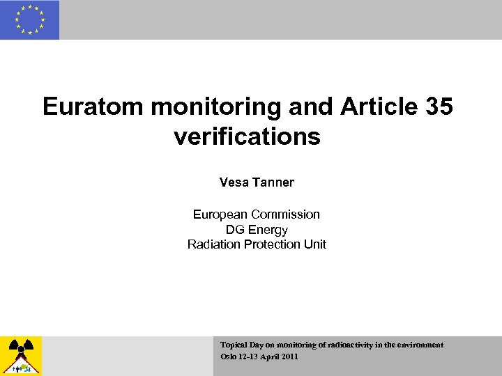Euratom monitoring and Article 35 verifications Vesa Tanner European Commission DG Energy Radiation Protection Unit Topical Day on monitoring of radioactivity in the environment Oslo 12 -13 April 2011