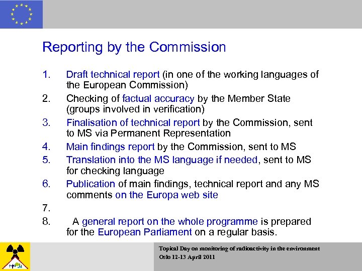 Reporting by the Commission 1. 2. 3. 4. 5. 6. 7. 8. Draft technical report (in one of the working languages of the European Commission) Checking of factual accuracy by the Member State (groups involved in verification) Finalisation of technical report by the Commission, sent to MS via Permanent Representation Main findings report by the Commission, sent to MS Translation into the MS language if needed, sent to MS for checking language Publication of main findings, technical report and any MS comments on the Europa web site A general report on the whole programme is prepared for the European Parliament on a regular basis. Topical Day on monitoring of radioactivity in the environment Oslo 12 -13 April 2011