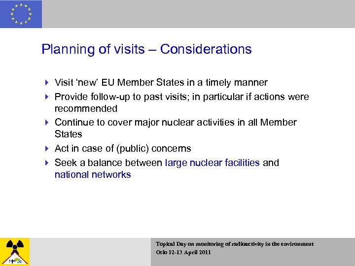 Planning of visits – Considerations 4 Visit ‘new’ EU Member States in a timely manner 4 Provide follow-up to past visits; in particular if actions were recommended 4 Continue to cover major nuclear activities in all Member States 4 Act in case of (public) concerns 4 Seek a balance between large nuclear facilities and national networks Topical Day on monitoring of radioactivity in the environment Oslo 12 -13 April 2011
