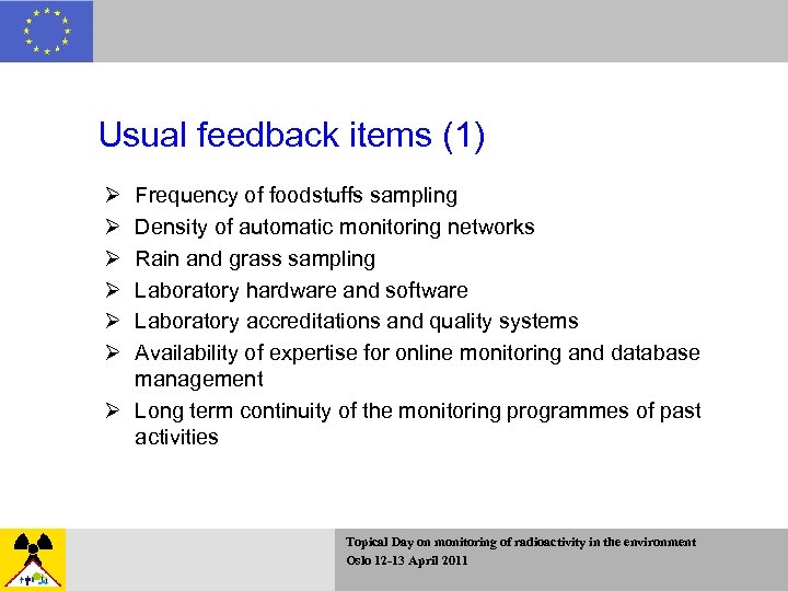 Usual feedback items (1) Ø Ø Ø Frequency of foodstuffs sampling Density of automatic monitoring networks Rain and grass sampling Laboratory hardware and software Laboratory accreditations and quality systems Availability of expertise for online monitoring and database management Ø Long term continuity of the monitoring programmes of past activities Topical Day on monitoring of radioactivity in the environment Oslo 12 -13 April 2011