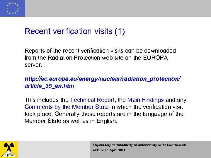 Recent verification visits (1) Reports of the recent verification visits can be downloaded from the Radiation Protection web site on the EUROPA server: http: //ec. europa. eu/energy/nuclear/radiation_protection/ article_35_en. htm This includes the Technical Report, the Main Findings and any Comments by the Member State in which the verification visit took place. Generally these reports are in the language of the Member State as well as in English. Topical Day on monitoring of radioactivity in the environment Oslo 12 -13 April 2011