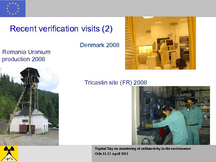 Recent verification visits (2) Denmark 2008 Romania Uranium production 2008 Tricastin site (FR) 2008 Topical Day on monitoring of radioactivity in the environment Oslo 12 -13 April 2011