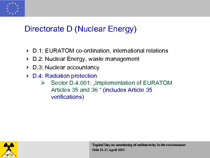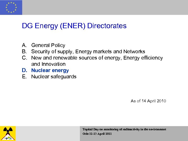 DG Energy (ENER) Directorates A. General Policy B. Security of supply, Energy markets and Networks C. New and renewable sources of energy, Energy efficiency and Innovation D. Nuclear energy E. Nuclear safeguards As of 14 April 2010 Topical Day on monitoring of radioactivity in the environment Oslo 12 -13 April 2011