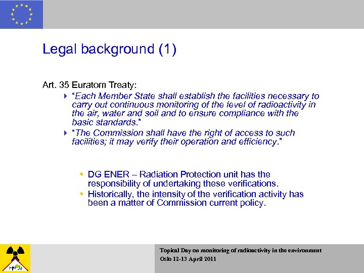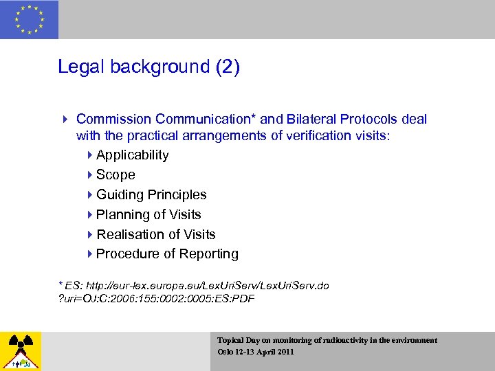 Legal background (2) 4 Commission Communication* and Bilateral Protocols deal with the practical arrangements of verification visits: 4 Applicability 4 Scope 4 Guiding Principles 4 Planning of Visits 4 Realisation of Visits 4 Procedure of Reporting * ES: http: //eur-lex. europa. eu/Lex. Uri. Serv. do ? uri=OJ: C: 2006: 155: 0002: 0005: ES: PDF Topical Day on monitoring of radioactivity in the environment Oslo 12 -13 April 2011