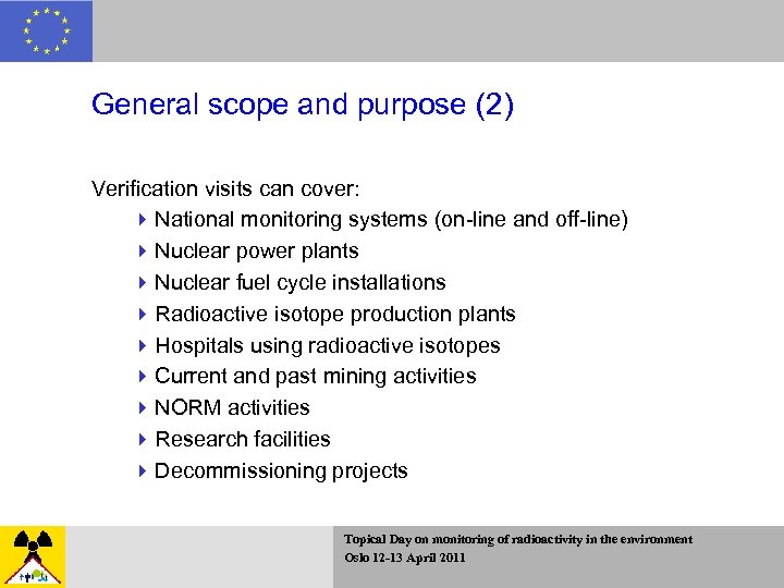 General scope and purpose (2) Verification visits can cover: 4 National monitoring systems (on-line and off-line) 4 Nuclear power plants 4 Nuclear fuel cycle installations 4 Radioactive isotope production plants 4 Hospitals using radioactive isotopes 4 Current and past mining activities 4 NORM activities 4 Research facilities 4 Decommissioning projects Topical Day on monitoring of radioactivity in the environment Oslo 12 -13 April 2011