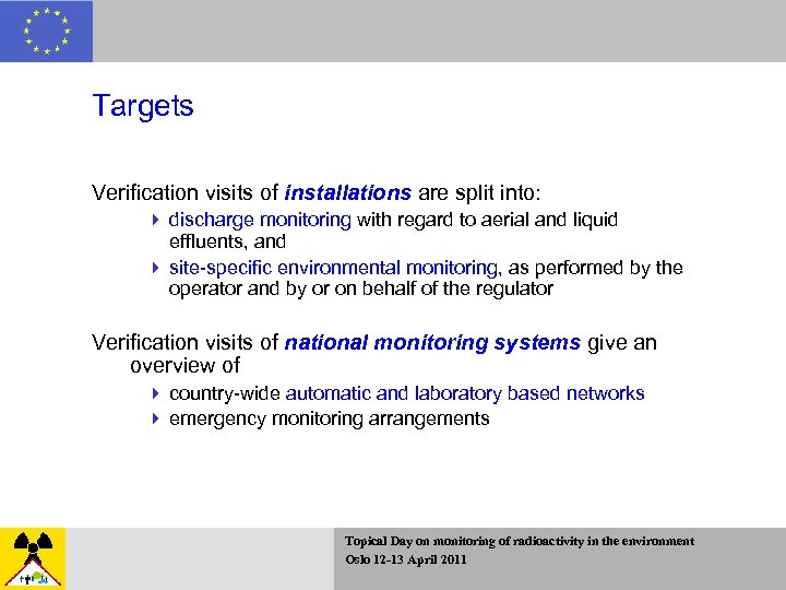 Targets Verification visits of installations are split into: 4 discharge monitoring with regard to aerial and liquid effluents, and 4 site-specific environmental monitoring, as performed by the operator and by or on behalf of the regulator Verification visits of national monitoring systems give an overview of 4 country-wide automatic and laboratory based networks 4 emergency monitoring arrangements Topical Day on monitoring of radioactivity in the environment Oslo 12 -13 April 2011