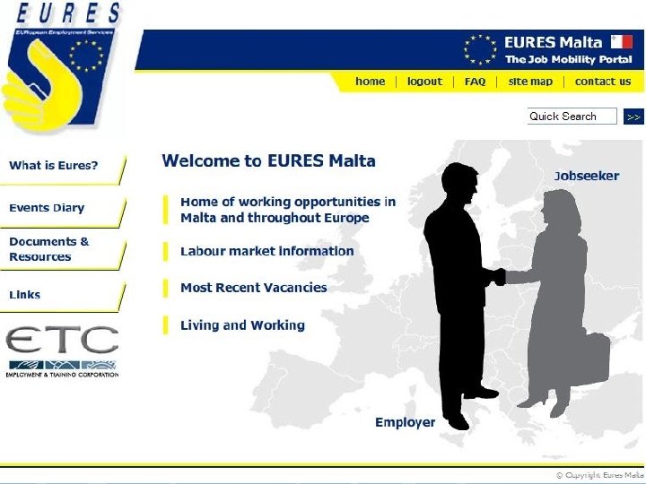 Looking for a Job in Malta Through EURES Malta website http: //www. euresmalta. com vacancy database with search facility used by employers and job seekers. EURES Freephone Service 80076505