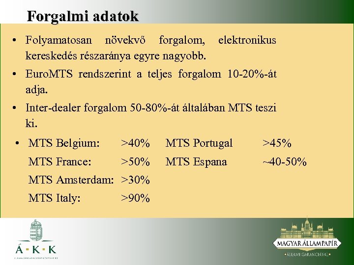 Forgalmi adatok • Folyamatosan növekvő forgalom, elektronikus kereskedés részaránya egyre nagyobb. • Euro. MTS rendszerint a teljes forgalom 10 -20%-át adja. • Inter-dealer forgalom 50 -80%-át általában MTS teszi ki. • MTS Belgium: >40% MTS Portugal >45% MTS France: >50% MTS Espana ~40 -50% MTS Amsterdam: >30% MTS Italy: >90%