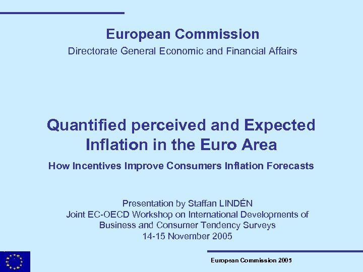 European Commission Directorate General Economic and Financial Affairs Quantified perceived and Expected Inflation in the Euro Area How Incentives Improve Consumers Inflation Forecasts Presentation by Staffan LINDÉN Joint EC-OECD Workshop on International Developments of Business and Consumer Tendency Surveys 14 -15 November 2005 European Commission 2005