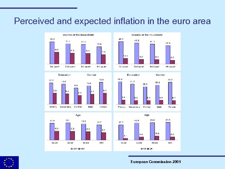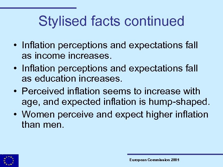 Stylised facts continued • Inflation perceptions and expectations fall as income increases. • Inflation perceptions and expectations fall as education increases. • Perceived inflation seems to increase with age, and expected inflation is hump-shaped. • Women perceive and expect higher inflation than men. European Commission 2005