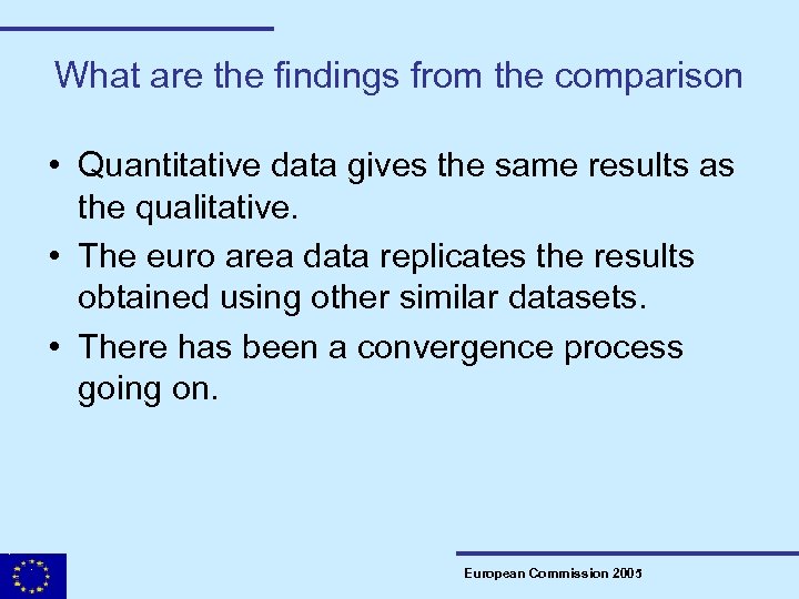 What are the findings from the comparison • Quantitative data gives the same results as the qualitative. • The euro area data replicates the results obtained using other similar datasets. • There has been a convergence process going on. European Commission 2005
