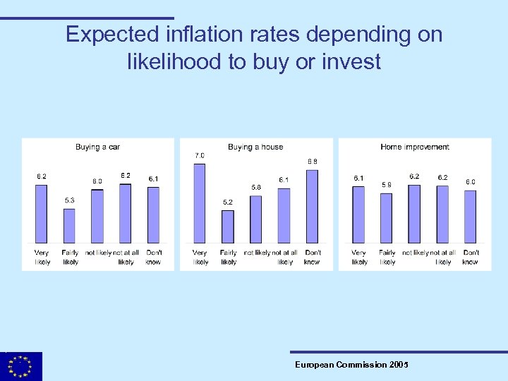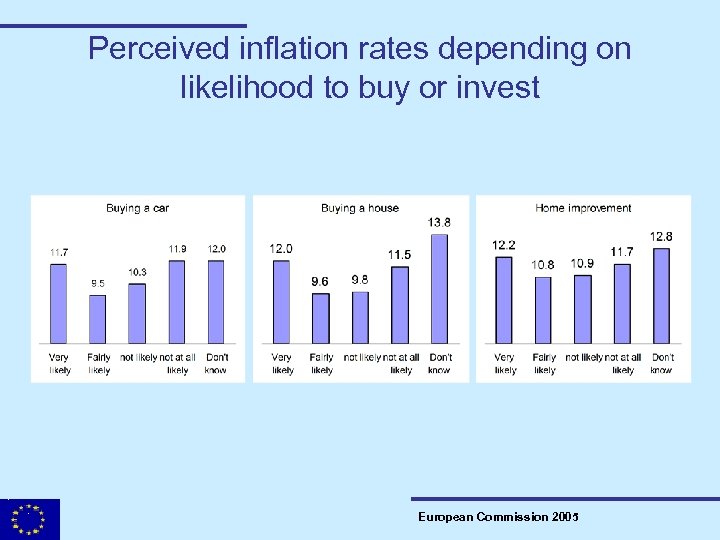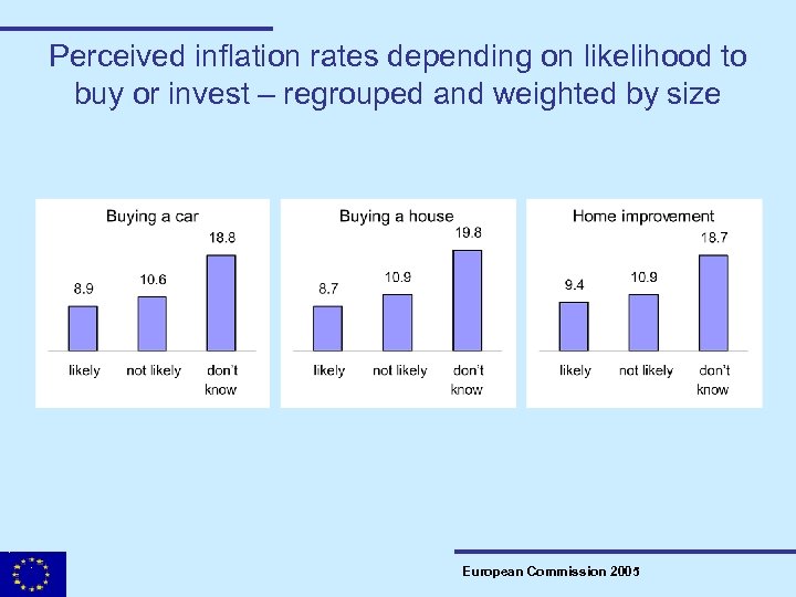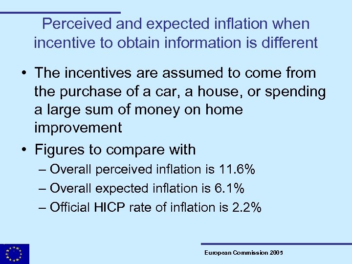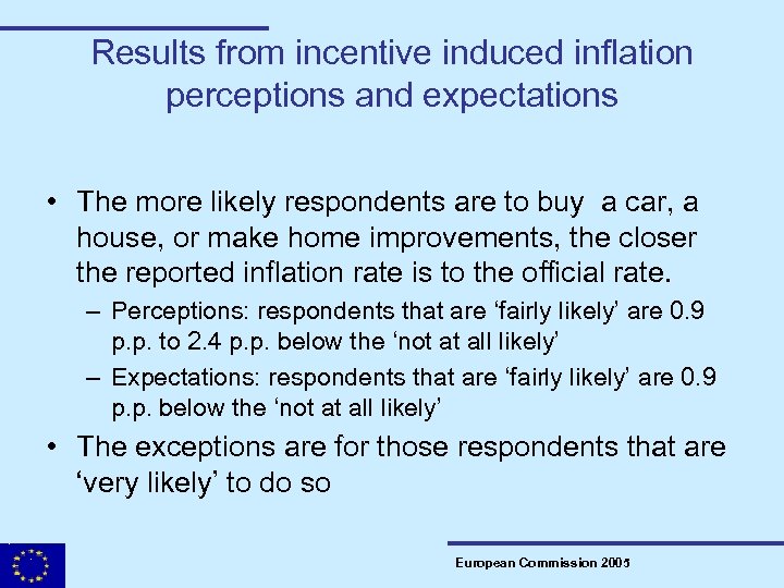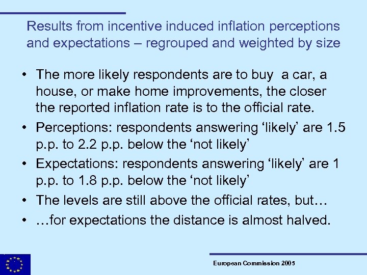 Results from incentive induced inflation perceptions and expectations – regrouped and weighted by size • The more likely respondents are to buy a car, a house, or make home improvements, the closer the reported inflation rate is to the official rate. • Perceptions: respondents answering ‘likely’ are 1. 5 p. p. to 2. 2 p. p. below the ‘not likely’ • Expectations: respondents answering ‘likely’ are 1 p. p. to 1. 8 p. p. below the ‘not likely’ • The levels are still above the official rates, but… • …for expectations the distance is almost halved. European Commission 2005