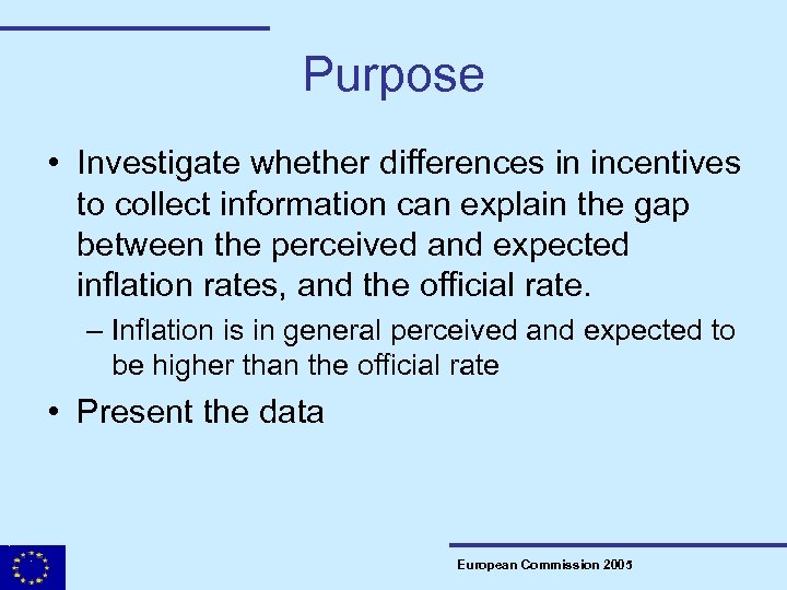 Purpose • Investigate whether differences in incentives to collect information can explain the gap between the perceived and expected inflation rates, and the official rate. – Inflation is in general perceived and expected to be higher than the official rate • Present the data European Commission 2005