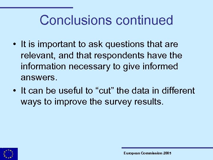 Conclusions continued • It is important to ask questions that are relevant, and that respondents have the information necessary to give informed answers. • It can be useful to “cut” the data in different ways to improve the survey results. European Commission 2005