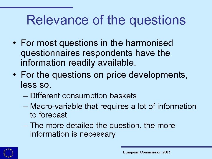 Relevance of the questions • For most questions in the harmonised questionnaires respondents have the information readily available. • For the questions on price developments, less so. – Different consumption baskets – Macro-variable that requires a lot of information to forecast – The more detailed the question, the more information is necessary European Commission 2005