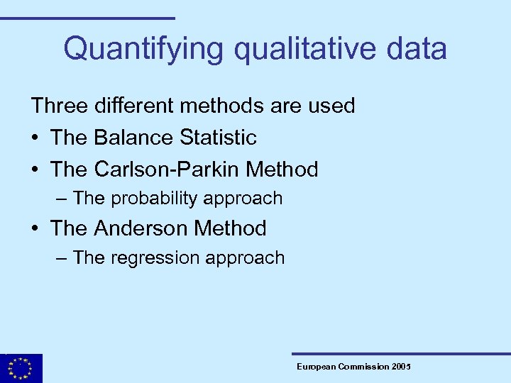 Quantifying qualitative data Three different methods are used • The Balance Statistic • The Carlson-Parkin Method – The probability approach • The Anderson Method – The regression approach European Commission 2005