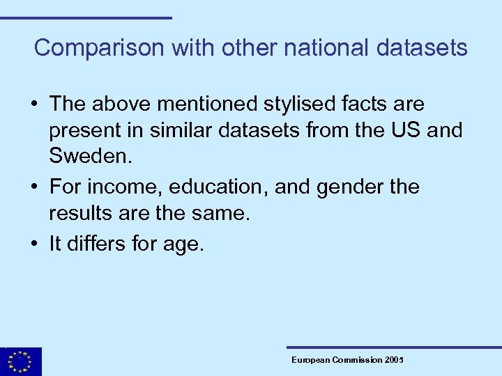 Comparison with other national datasets • The above mentioned stylised facts are present in similar datasets from the US and Sweden. • For income, education, and gender the results are the same. • It differs for age. European Commission 2005