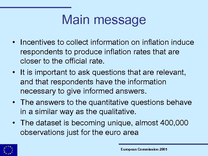 Main message • Incentives to collect information on inflation induce respondents to produce inflation rates that are closer to the official rate. • It is important to ask questions that are relevant, and that respondents have the information necessary to give informed answers. • The answers to the quantitative questions behave in a similar way as the qualitative. • The dataset is becoming unique, almost 400, 000 observations just for the euro area European Commission 2005