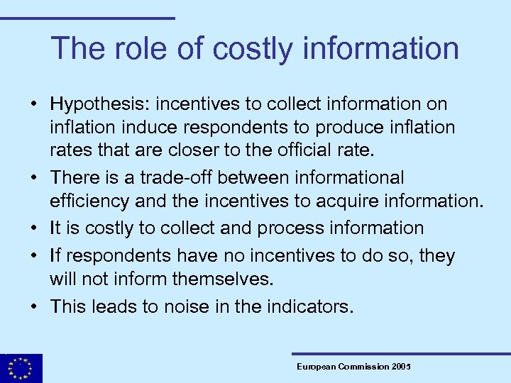 The role of costly information • Hypothesis: incentives to collect information on inflation induce respondents to produce inflation rates that are closer to the official rate. • There is a trade-off between informational efficiency and the incentives to acquire information. • It is costly to collect and process information • If respondents have no incentives to do so, they will not inform themselves. • This leads to noise in the indicators. European Commission 2005