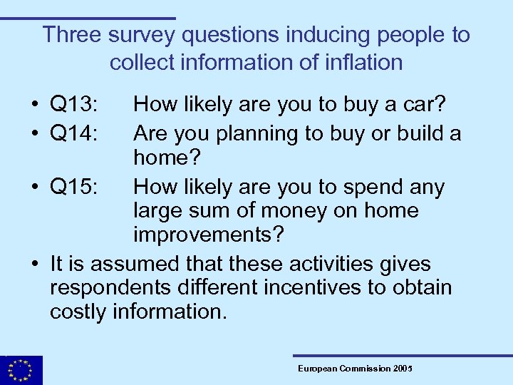 Three survey questions inducing people to collect information of inflation • Q 13: • Q 14: How likely are you to buy a car? Are you planning to buy or build a home? • Q 15: How likely are you to spend any large sum of money on home improvements? • It is assumed that these activities gives respondents different incentives to obtain costly information. European Commission 2005