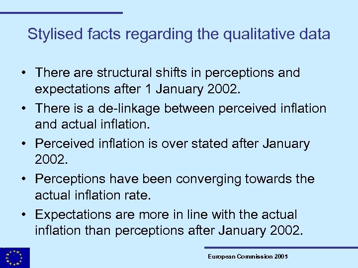 Stylised facts regarding the qualitative data • There are structural shifts in perceptions and expectations after 1 January 2002. • There is a de-linkage between perceived inflation and actual inflation. • Perceived inflation is over stated after January 2002. • Perceptions have been converging towards the actual inflation rate. • Expectations are more in line with the actual inflation than perceptions after January 2002. European Commission 2005