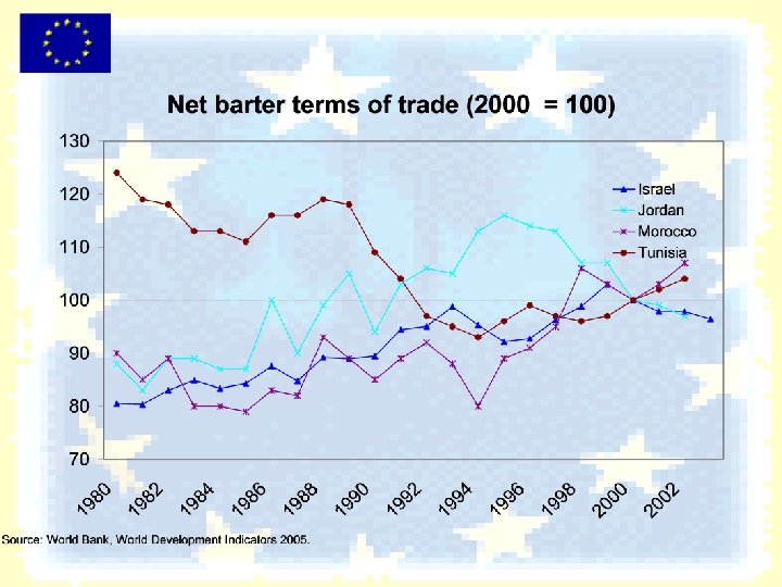 Determine AA impact q Import function M=M(Y, e, …) q AA dummy variable q other dummy variables to control for conflicts (ALG, ISR, …) q N=5 (ALG, ISR, JOR, MOR, TUN) q T=13 (1991 -2003) q Data: Eurostat COMEXT, IMF